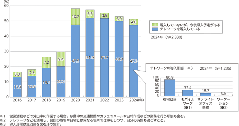 総務省の『令和6年通信利用動向調査』によると、テレワークを導入している企業は2019年で20.2%でしたが、2024年は47.3%と2倍以上に上昇しています。日本の企業において働き方が大きく変化したことが分かります。