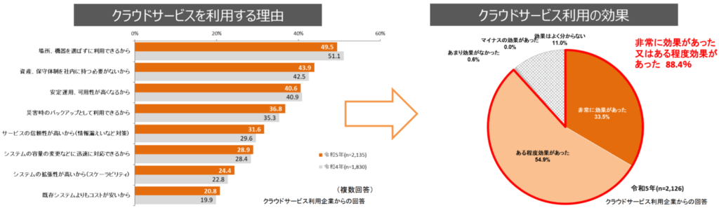 特に現代のWebサービスは前述したようにクラウドで動いていることが大半です。総務省の「令和5年通信利用動向調査」でも、クラウドを利用する企業の88.4%が「効果あり」と回答しており、性能改善はクラウド環境の最適化と切り離せない関係になっています。