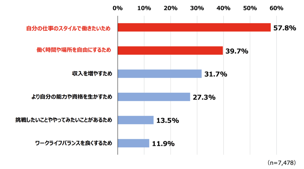 内閣官房が公表したフリーランス実態調査結果によると、フリーランスとして独立した方の約4割が、働く時間や場所を自由にするために今のスタイルを選んだと回答しています。