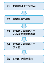 以下は、具体的な相談対応手順となります。なお、当社は、以下の対応に当たり、相談者・行為者などのプライバシーを保護するために必要な措置を講じます。